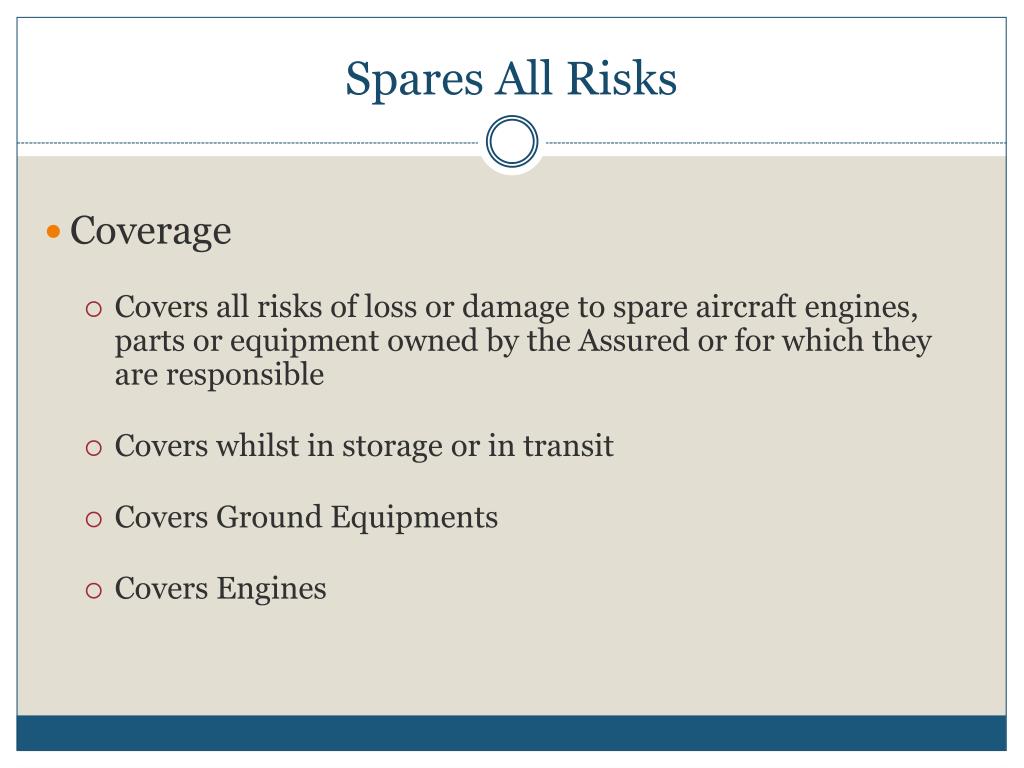 Spares All Risks • Coverage • Covers all risks of loss or damage to spare aircraft engines, parts or equipment owned by the Assured or for which they are responsible • Covers whilst in storage or in transit • Covers Ground Equipments • Covers Engines