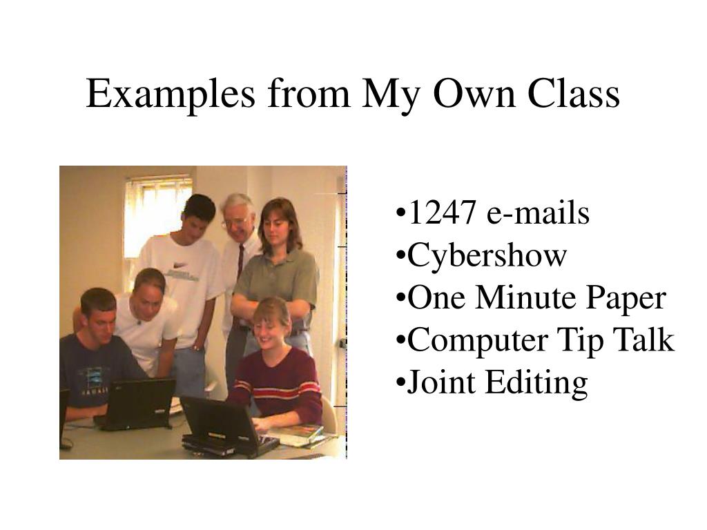 Examples from My Own Class • 1247 e-mails • Cybershow • One Minute Paper • Computer Tip Talk • Joint Editing