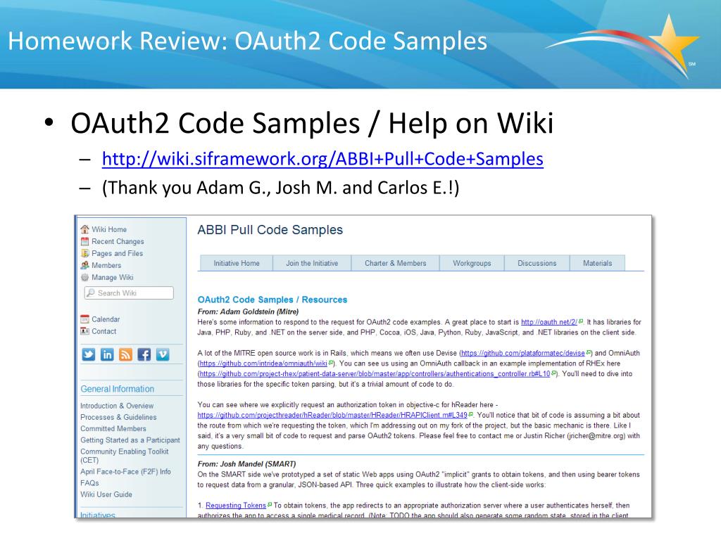 Homework Review: OAuth2 Code Samples • OAuth2 Code Samples / Help on Wiki • http://wiki.siframework.org/ABBI+Pull+Code+Samples • (Thank you Adam G., Josh M. and Carlos E.!)