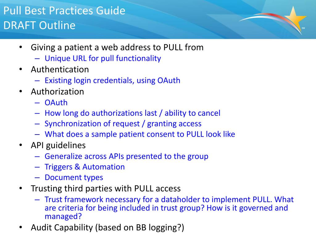 Pull Best Practices GuideDRAFT Outline • Giving a patient a web address to PULL from • Unique URL for pull functionality • Authentication • Existing login credentials, using OAuth • Authorization • OAuth • How long do authorizations last / ability to cancel • Synchronization of request / granting access • What does a sample patient consent to PULL look like • API guidelines • Generalize across APIs presented to the group • Triggers & Automation • Document types • Trusting third parties with PULL access • Trust framework necessary for a dataholder to implement PULL. What are criteria for being included in trust group? How is it governed and managed? • Audit Capability (based on BB logging?)