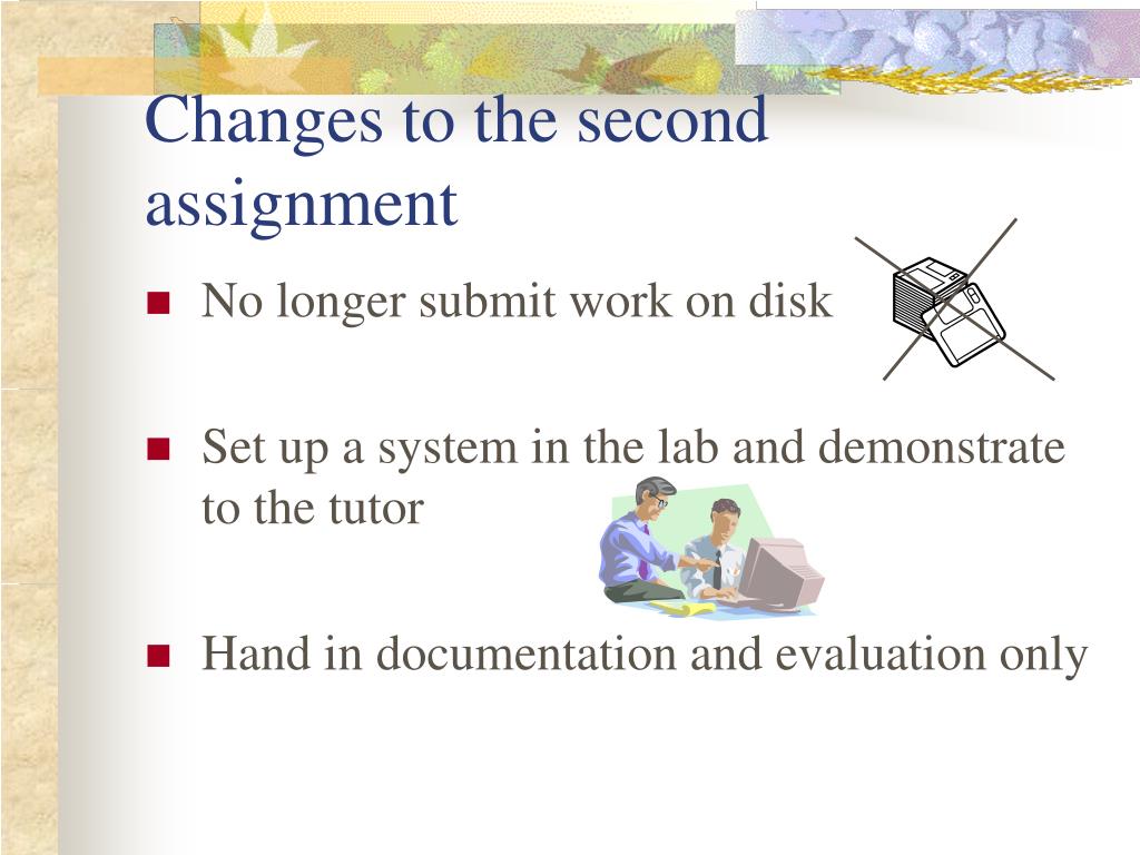 Changes to the second assignment • No longer submit work on disk • Set up a system in the lab and demonstrate to the tutor • Hand in documentation and evaluation only