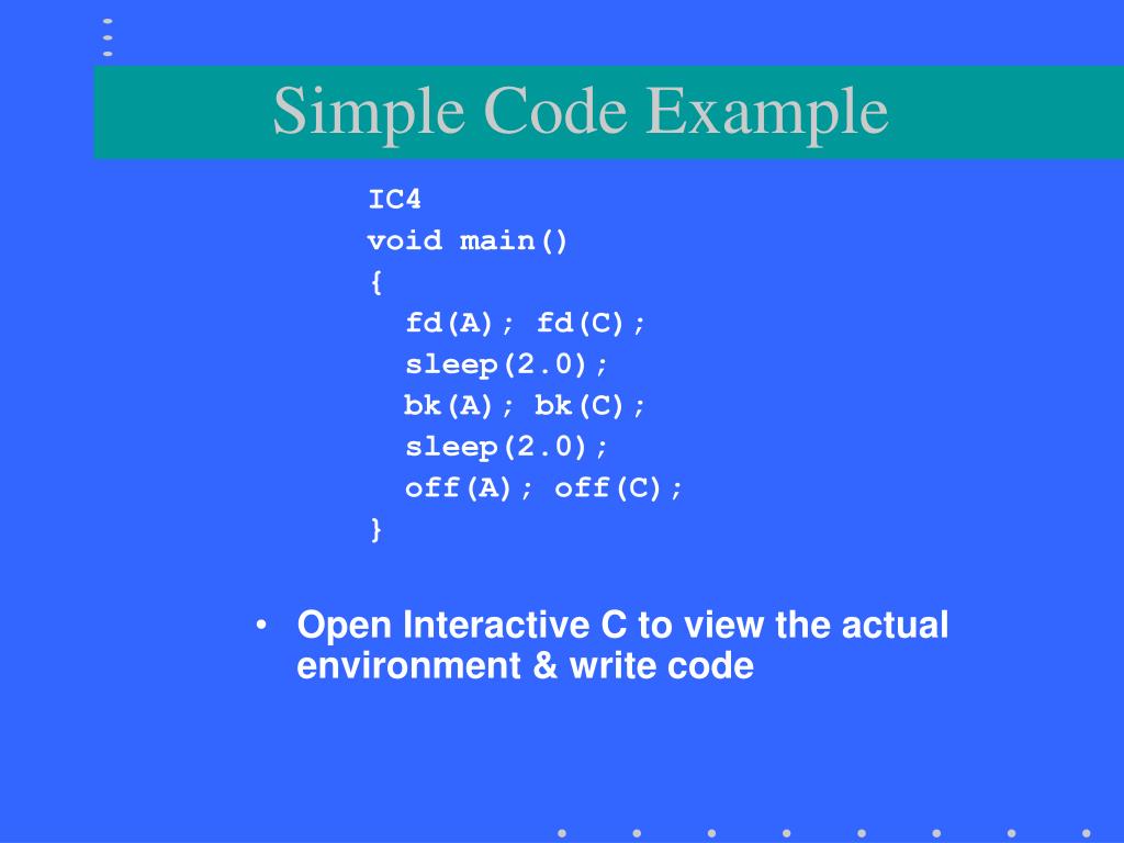 IC4 voidmain() { fd(A); fd(C); sleep(2.0); bk(A); bk(C); sleep(2.0); off(A); off(C); } Open Interactive C to view the actual environment & write code Simple Code Example