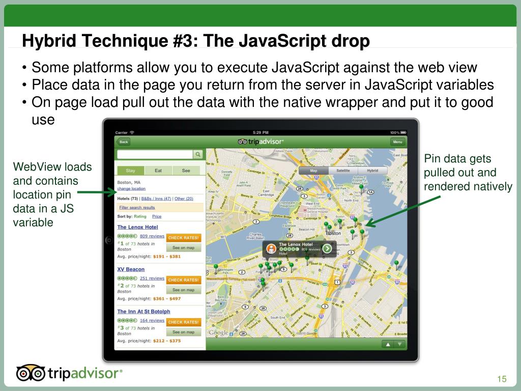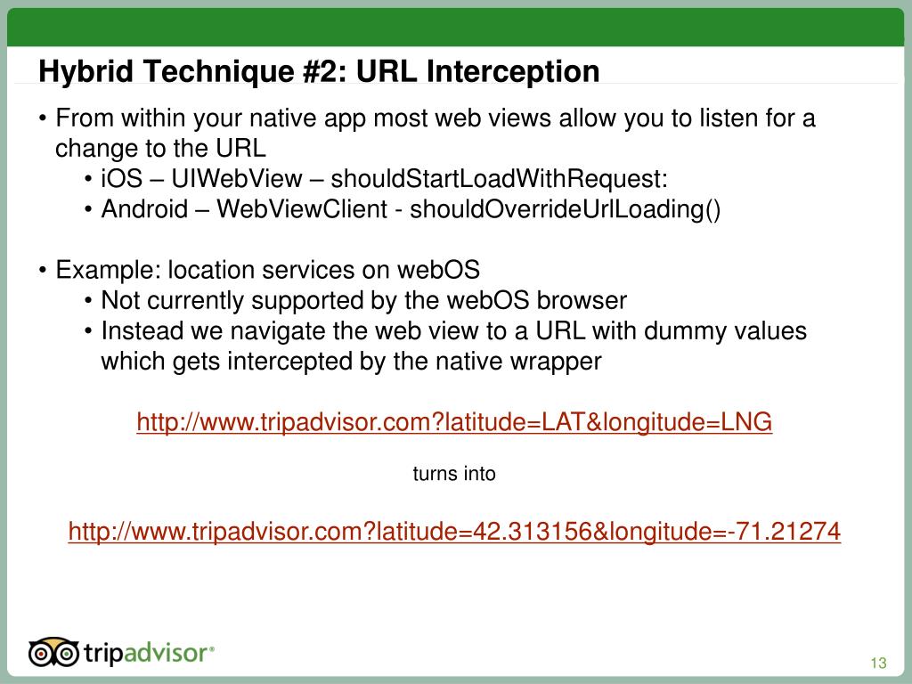 Hybrid Technique #2: URL Interception • From within your native app most web views allow you to listen for a change to the URL • iOS – UIWebView – shouldStartLoadWithRequest: • Android – WebViewClient - shouldOverrideUrlLoading() • Example: location services on webOS • Not currently supported by the webOS browser • Instead we navigate the web view to a URL with dummy values which gets intercepted by the native wrapper • http://www.tripadvisor.com?latitude=LAT&longitude=LNG • turns into • http://www.tripadvisor.com?latitude=42.313156&longitude=-71.21274