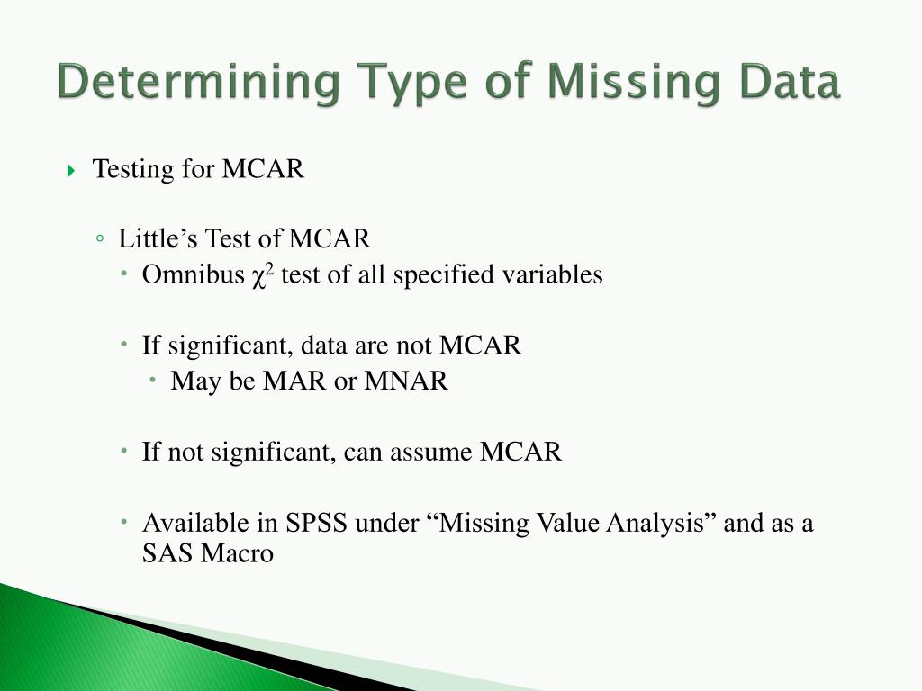 Determining Type of Missing Data • Testing for MCAR • Little’s Test of MCAR • Omnibus χ2 test of all specified variables • If significant, data are not MCAR • May be MAR or MNAR • If not significant, can assume MCAR • Available in SPSS under “Missing Value Analysis” and as a SAS Macro