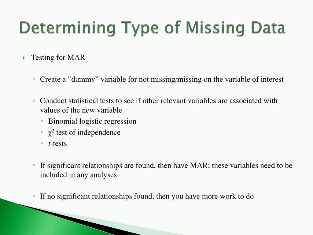 Determining Type of Missing Data • Testing for MAR • Create a “dummy” variable for not missing/missing on the variable of interest • Conduct statistical tests to see if other relevant variables are associated with values of the new variable • Binomial logistic regression • χ2 test of independence • t-tests • If significant relationships are found, then have MAR; these variables need to be included in any analyses • If no significant relationships found, then you have more work to do