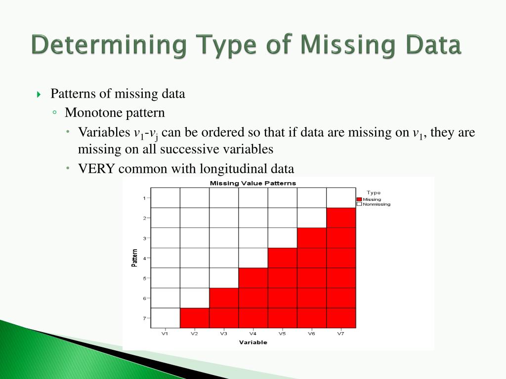 Determining Type of Missing Data • Patterns of missing data • Monotone pattern • Variables v1-vj can be ordered so that if data are missing on v1, they are missing on all successive variables • VERY common with longitudinal data