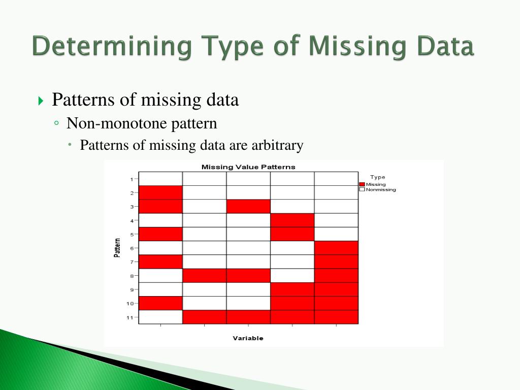 Determining Type of Missing Data • Patterns of missing data • Non-monotone pattern • Patterns of missing data are arbitrary