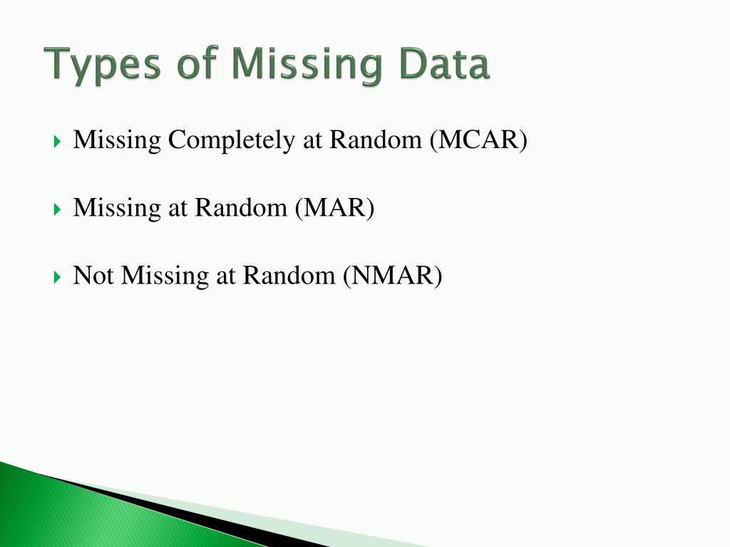 Types of Missing Data • Missing Completely at Random (MCAR) • Missing at Random (MAR) • Not Missing at Random (NMAR)