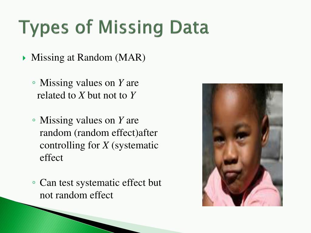 Types of Missing Data • Missing at Random (MAR) • Missing values on Y are related to X but not to Y • Missing values on Y are random (random effect)after controlling for X (systematic effect • Can test systematic effect but not random effect