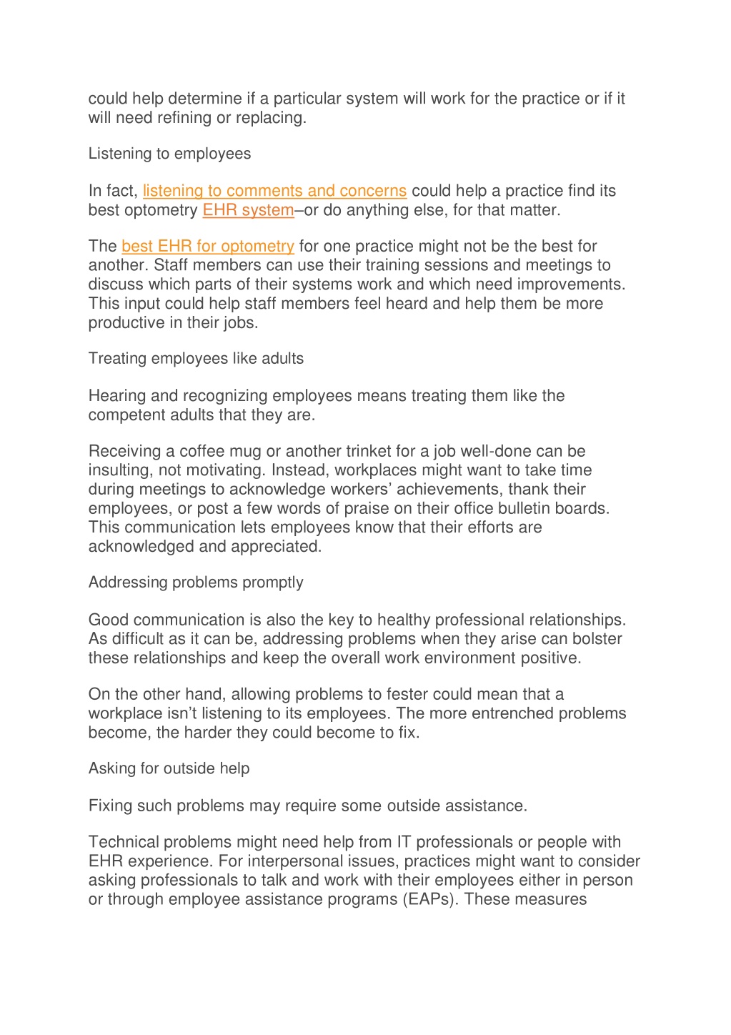 could help determine if a particular system will work for the practice or if it will need refining or replacing. Listening to employees In fact, listening to comments and concerns could help a practice find its best optometry EHR system–or do anything else, for that matter. The best EHR for optometry for one practice might not be the best for another. Staff members can use their training sessions and meetings to discuss which parts of their systems work and which need improvements. This input could help staff members feel heard and help them be more productive in their jobs. Treating employees like adults Hearing and recognizing employees means treating them like the competent adults that they are. Receiving a coffee mug or another trinket for a job well-done can be insulting, not motivating. Instead, workplaces might want to take time during meetings to acknowledge workers’ achievements, thank their employees, or post a few words of praise on their office bulletin boards. This communication lets employees know that their efforts are acknowledged and appreciated. Addressing problems promptly Good communication is also the key to healthy professional relationships. As difficult as it can be, addressing problems when they arise can bolster these relationships and keep the overall work environment positive. On the other hand, allowing problems to fester could mean that a workplace isn’t listening to its employees. The more entrenched problems become, the harder they could become to fix. Asking for outside help Fixing such problems may require some outside assistance. Technical problems might need help from IT professionals or people with EHR experience. For interpersonal issues, practices might want to consider asking professionals to talk and work with their employees either in person or through employee assistance programs (EAPs). These measures