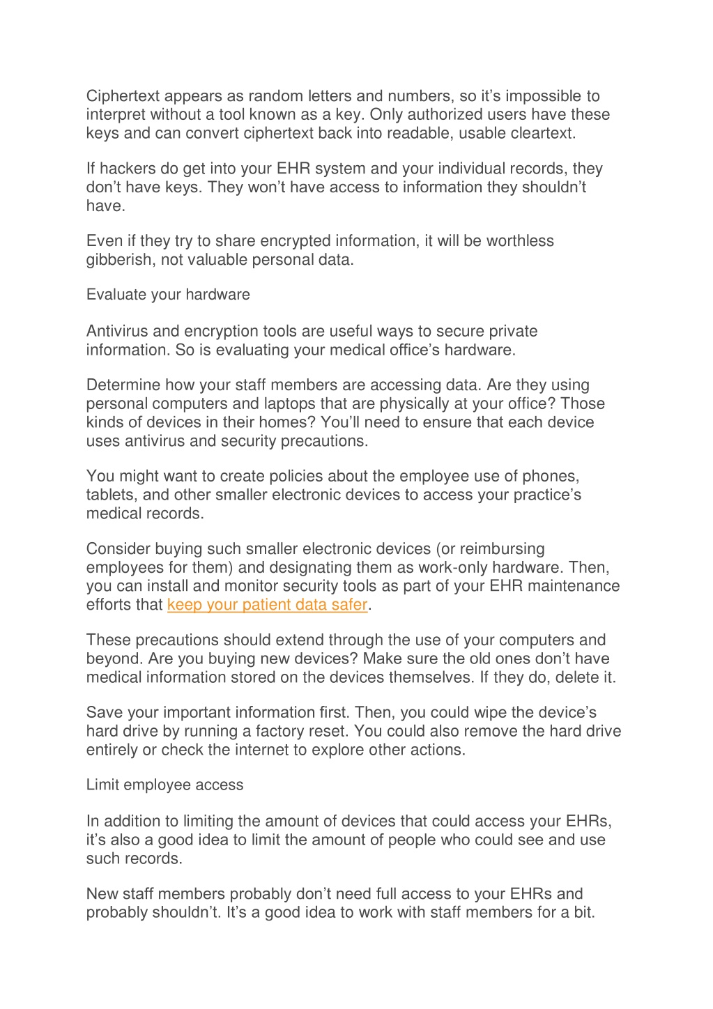 Ciphertext appears as random letters and numbers, so it’s impossible to interpret without a tool known as a key. Only authorized users have these keys and can convert ciphertext back into readable, usable cleartext. If hackers do get into your EHR system and your individual records, they don’t have keys. They won’t have access to information they shouldn’t have. Even if they try to share encrypted information, it will be worthless gibberish, not valuable personal data. Evaluate your hardware Antivirus and encryption tools are useful ways to secure private information. So is evaluating your medical office’s hardware. Determine how your staff members are accessing data. Are they using personal computers and laptops that are physically at your office? Those kinds of devices in their homes? You’ll need to ensure that each device uses antivirus and security precautions. You might want to create policies about the employee use of phones, tablets, and other smaller electronic devices to access your practice’s medical records. Consider buying such smaller electronic devices (or reimbursing employees for them) and designating them as work-only hardware. Then, you can install and monitor security tools as part of your EHR maintenance efforts that keep your patient data safer. These precautions should extend through the use of your computers and beyond. Are you buying new devices? Make sure the old ones don’t have medical information stored on the devices themselves. If they do, delete it. Save your important information first. Then, you could wipe the device’s hard drive by running a factory reset. You could also remove the hard drive entirely or check the internet to explore other actions. Limit employee access In addition to limiting the amount of devices that could access your EHRs, it’s also a good idea to limit the amount of people who could see and use such records. New staff members probably don’t need full access to your EHRs and probably shouldn’t. It’s a good idea to work with staff members for a bit.