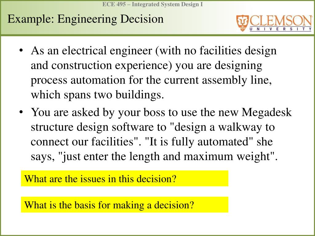 Example: Engineering Decision • As an electrical engineer (with no facilities design and construction experience) you are designing process automation for the current assembly line, which spans two buildings. • You are asked by your boss to use the new Megadesk structure design software to "design a walkway to connect our facilities". "It is fully automated" she says, "just enter the length and maximum weight". What are the issues in this decision? What is the basis for making a decision?