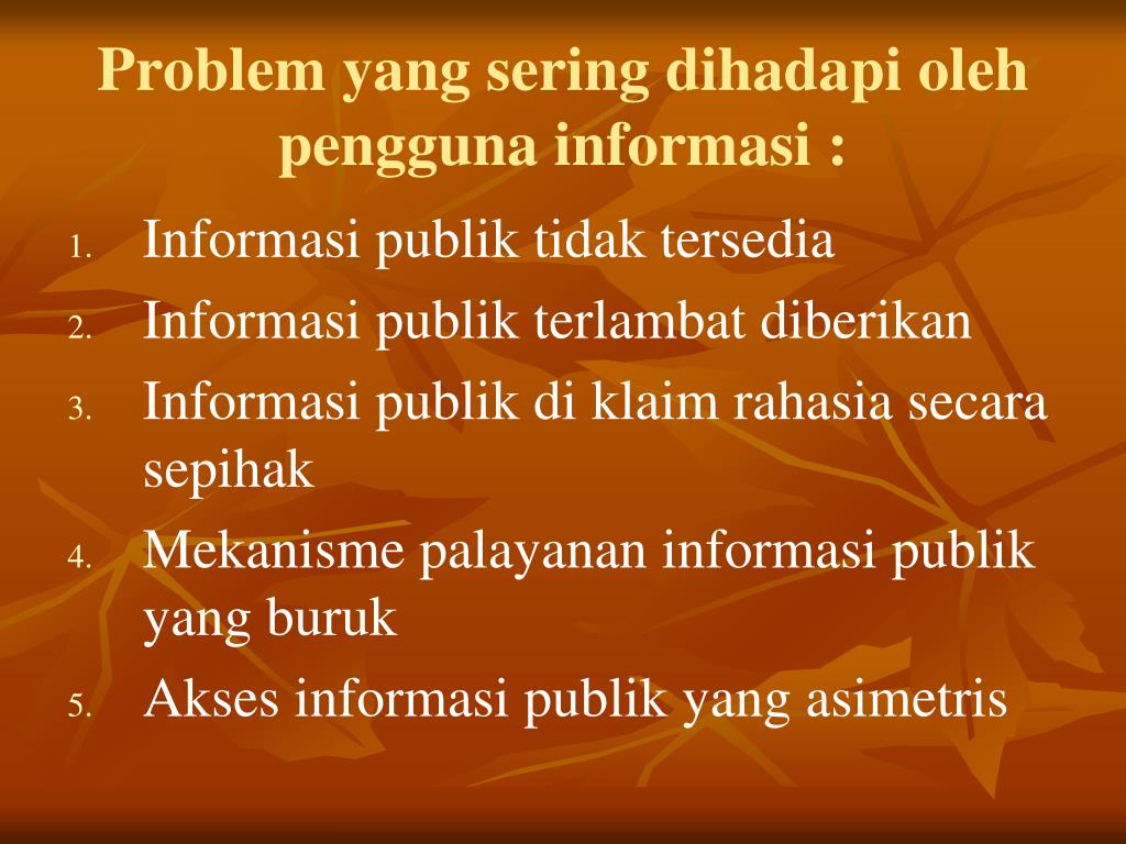 Problem yang sering dihadapi oleh pengguna informasi : • Informasi publik tidak tersedia • Informasi publik terlambat diberikan • Informasi publik di klaim rahasia secara sepihak • Mekanisme palayanan informasi publik yang buruk • Akses informasi publik yang asimetris