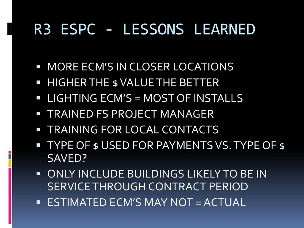 R3 ESPC - LESSONS LEARNED • MORE ECM’S IN CLOSER LOCATIONS • HIGHER THE $ VALUE THE BETTER • LIGHTING ECM’S = MOST OF INSTALLS • TRAINED FS PROJECT MANAGER • TRAINING FOR LOCAL CONTACTS • TYPE OF $ USED FOR PAYMENTS VS. TYPE OF $ SAVED? • ONLY INCLUDE BUILDINGS LIKELY TO BE IN SERVICE THROUGH CONTRACT PERIOD • ESTIMATED ECM’S MAY NOT = ACTUAL