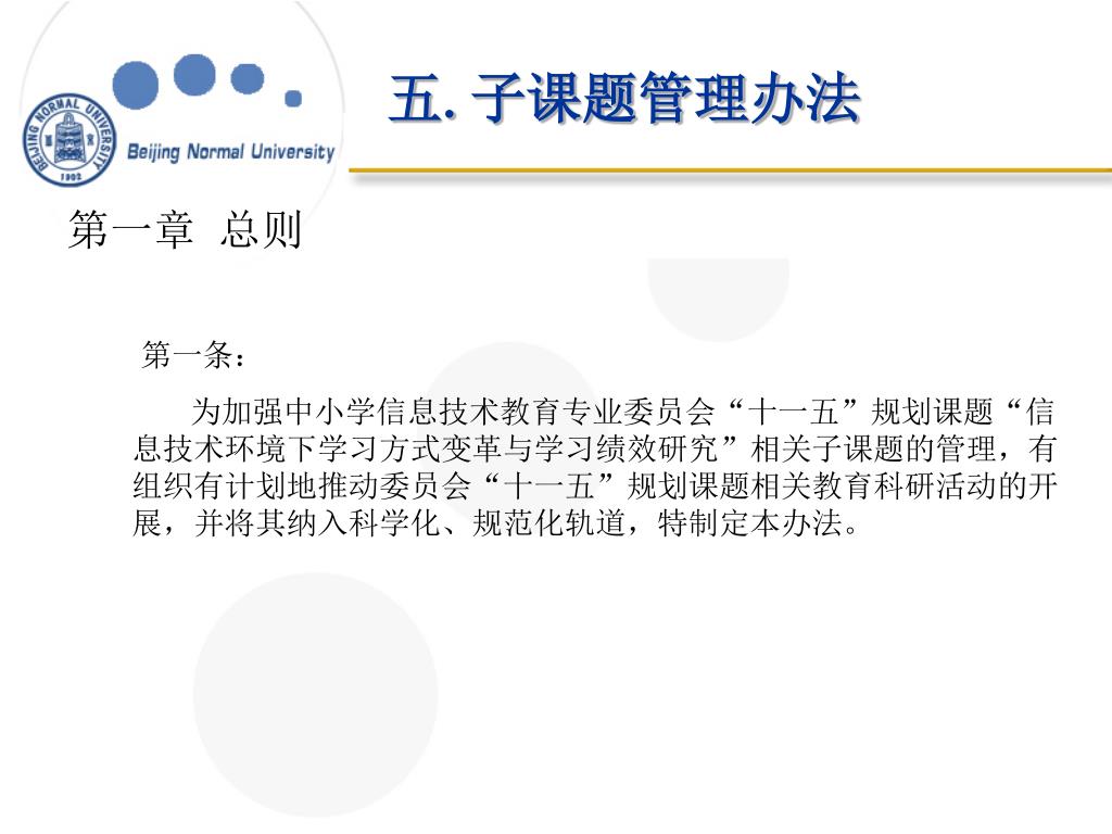 五.子课题管理办法 第一章 总则 第一条: 为加强中小学信息技术教育专业委员会“十一五”规划课题“信息技术环境下学习方式变革与学习绩效研究”相关子课题的管理,有组织有计划地推动委员会“十一五”规划课题相关教育科研活动的开展,并将其纳入科学化、规范化轨道,特制定本办法。
