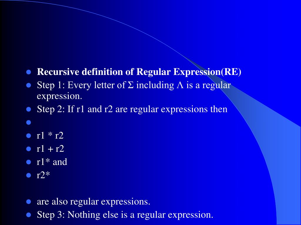 Recursive definition of Regular Expression(RE) • Step 1: Every letter of Σ including Λ is a regular expression. • Step 2: If r1 and r2 are regular expressions then • r1 * r2 • r1 + r2 • r1* and • r2* • are also regular expressions. • Step 3: Nothing else is a regular expression.
