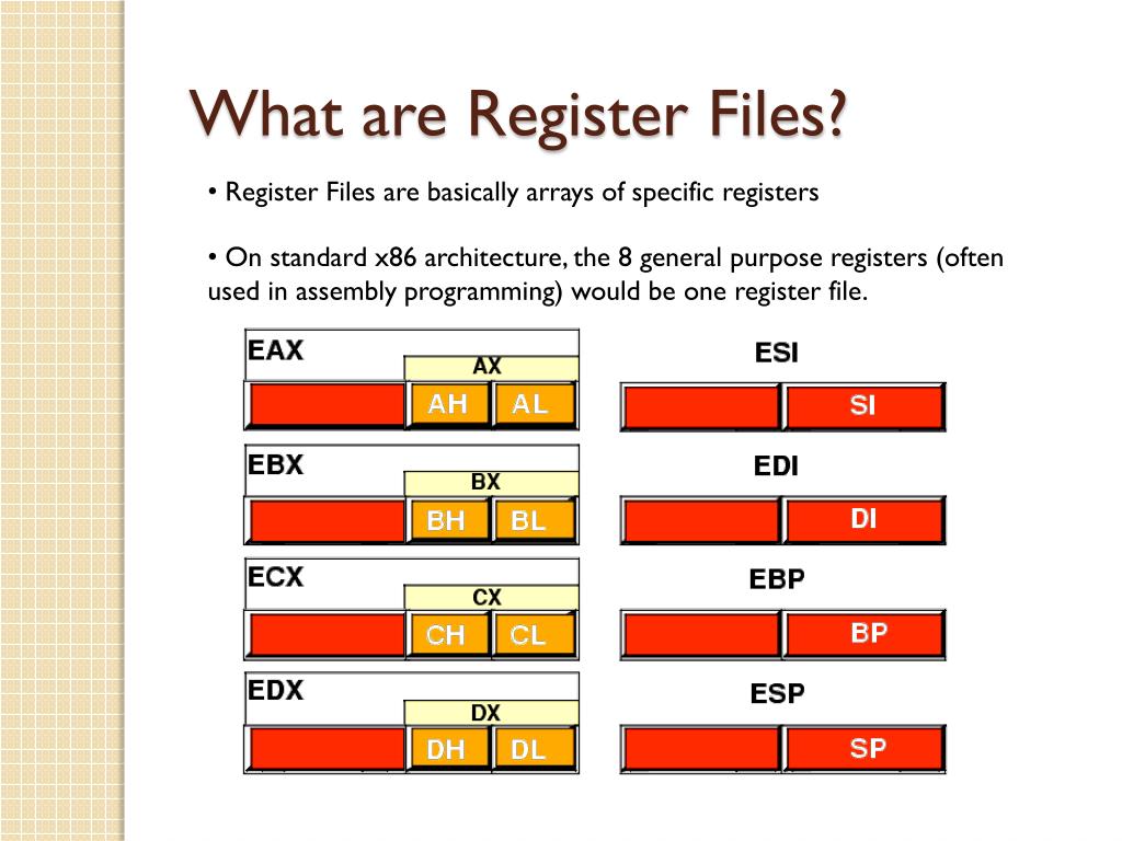 What are Register Files? • Register Files are basically arrays of specific registers • On standard x86 architecture, the 8 general purpose registers (often used in assembly programming) would be one register file.