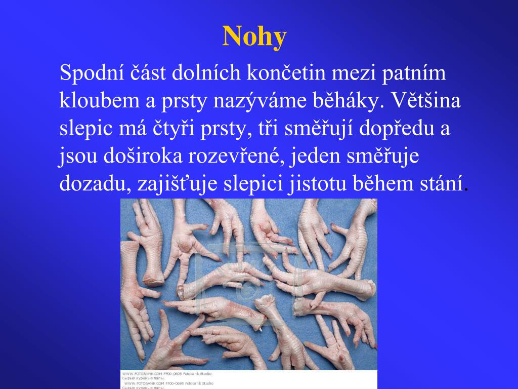 Nohy Spodní část dolních končetin mezi patním kloubem a prsty nazýváme běháky. Většina slepic má čtyři prsty, tři směřují dopředu a jsou doširoka rozevřené, jeden směřuje dozadu, zajišťuje slepici jistotu během stání.
