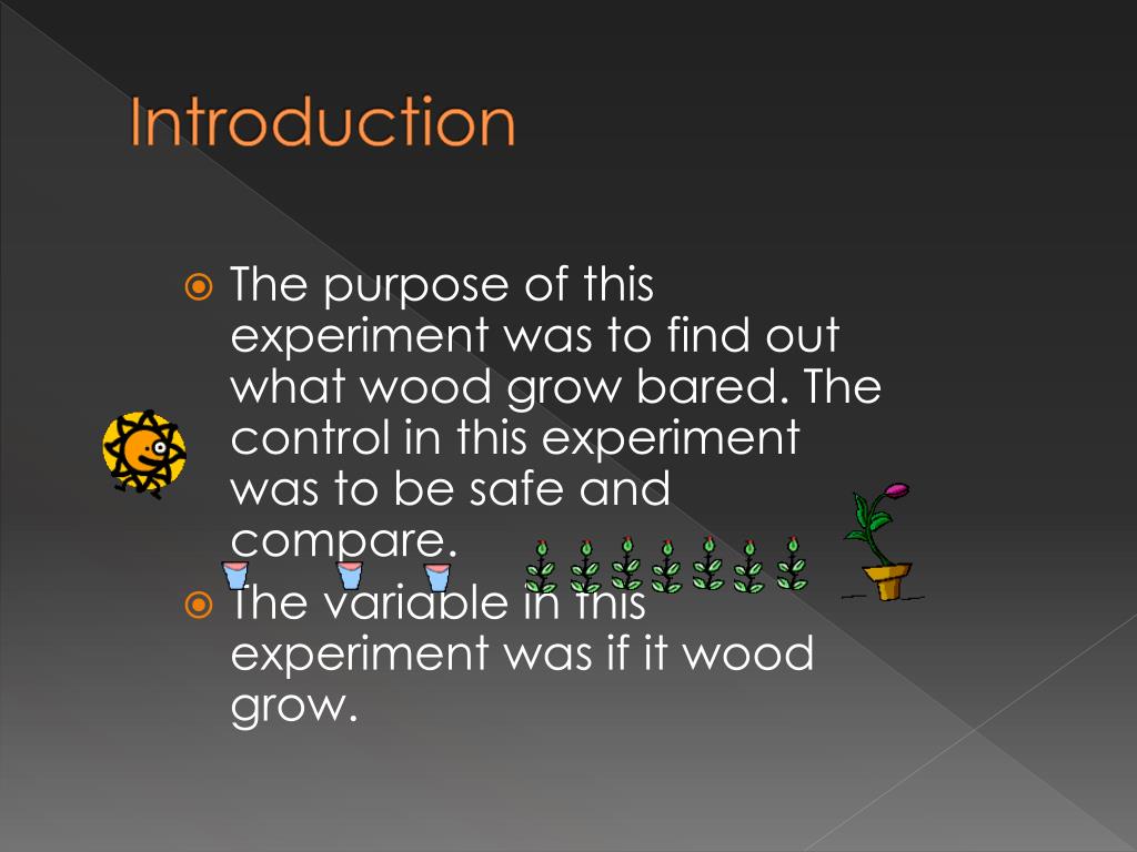 Introduction • The purpose of this experiment was to find out what wood grow bared. The control in this experiment was to be safe and compare. • The variable in this experiment was if it wood grow.