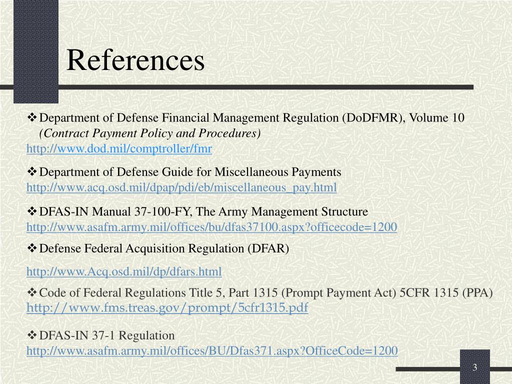 References • Department of Defense Financial Management Regulation (DoDFMR), Volume 10 (Contract Payment Policy and Procedures) • http://www.dod.mil/comptroller/fmr • Department of Defense Guide for Miscellaneous Payments • http://www.acq.osd.mil/dpap/pdi/eb/miscellaneous_pay.html • DFAS-IN Manual 37-100-FY, The Army Management Structure • http://www.asafm.army.mil/offices/bu/dfas37100.aspx?officecode=1200 • Defense Federal Acquisition Regulation (DFAR) • http://www.Acq.osd.mil/dp/dfars.html • Code of Federal Regulations Title 5, Part 1315 (Prompt Payment Act) 5CFR 1315 (PPA) • http://www.fms.treas.gov/prompt/5cfr1315.pdf • DFAS-IN 37-1 Regulation • http://www.asafm.army.mil/offices/BU/Dfas371.aspx?OfficeCode=1200