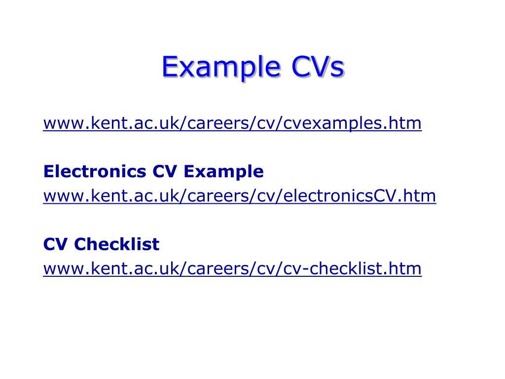 Example CVs www.kent.ac.uk/careers/cv/cvexamples.htm Electronics CV Example www.kent.ac.uk/careers/cv/electronicsCV.htm CV Checklist www.kent.ac.uk/careers/cv/cv-checklist.htm