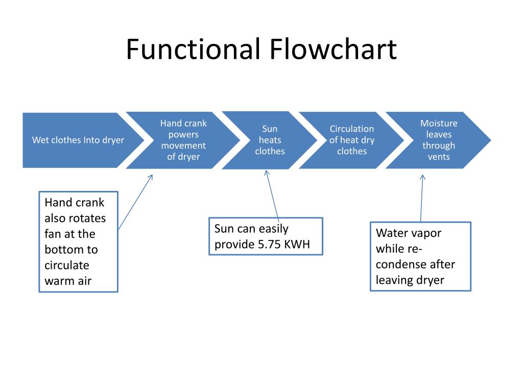 Functional Flowchart Hand crank also rotates fan at the bottom to circulate warm air Sun can easily provide 5.75 KWH Water vapor while re-condense after leaving dryer