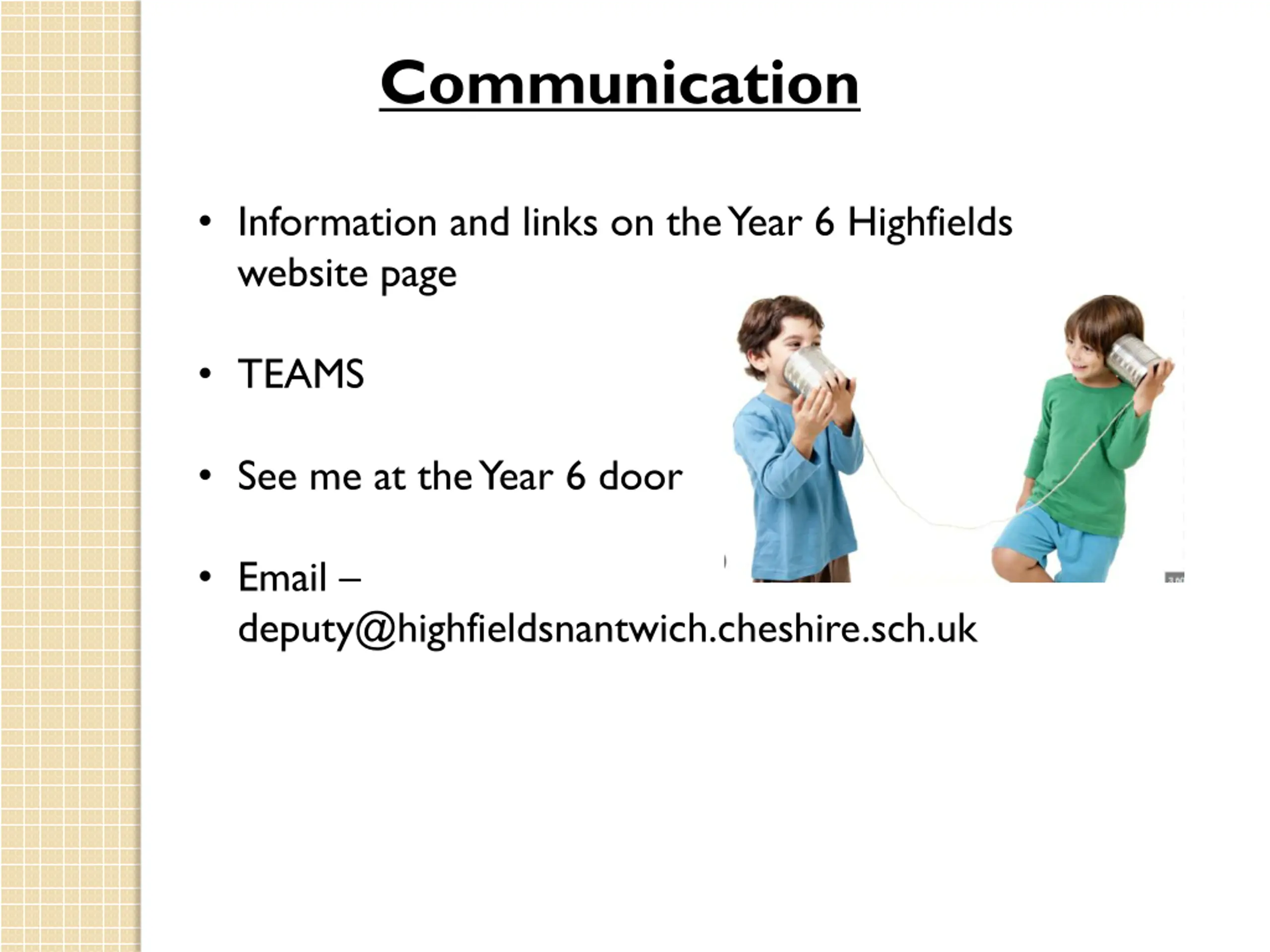 11. Communication • Information and links on the Year 6 Highfields website page • TEAMS • See me at the Year 6 door • Email – deputy@highfieldsnantwich.cheshire.sch.uk