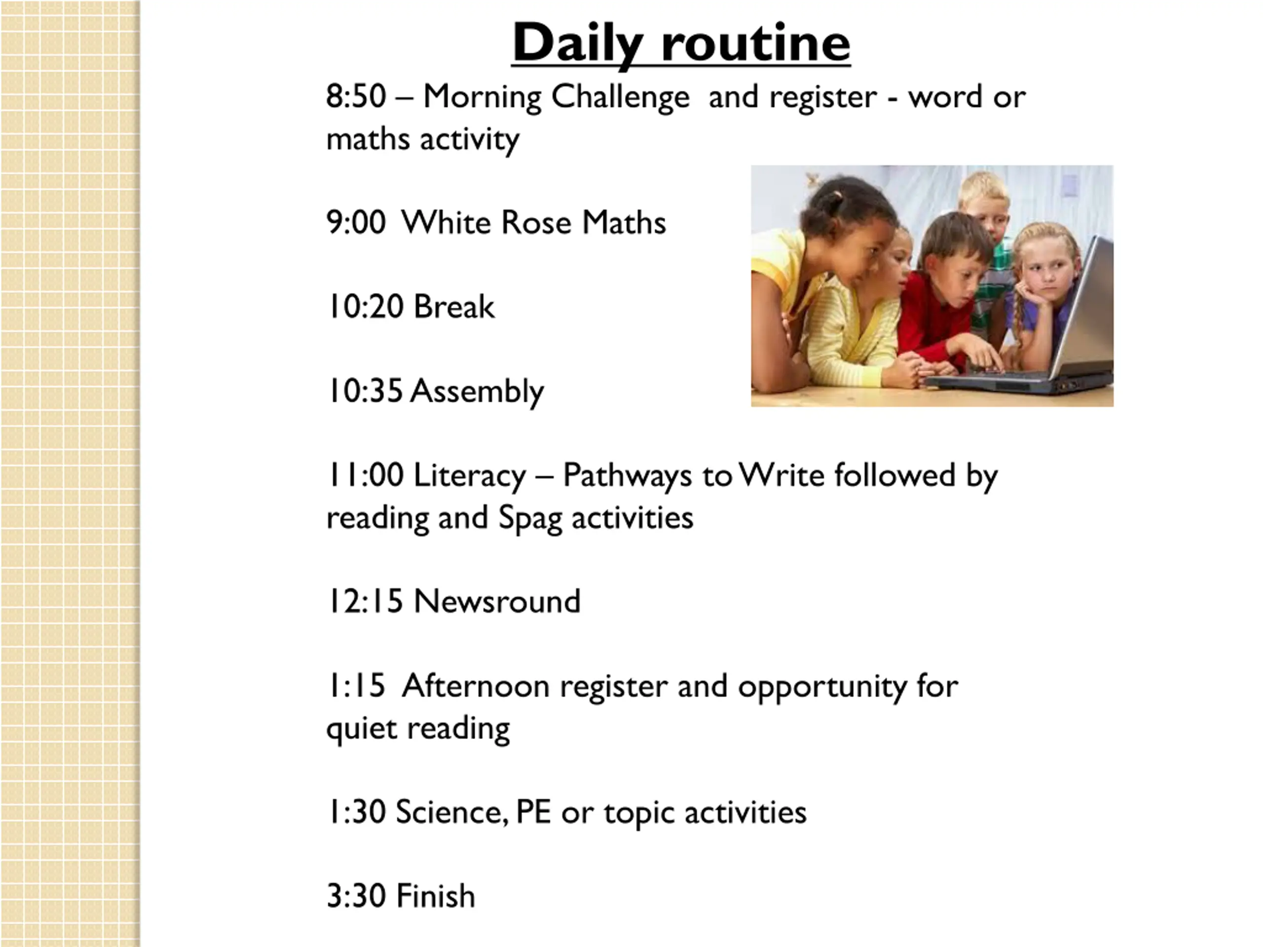 2. Daily routine 8:50 – Morning Challenge and register - word or maths activity 9:00 White Rose Maths 10:20 Break 10:35 Assembly 11:00 Literacy – Pathways to Write followed by reading and Spag activities 12:15 Newsround 1:15 Afternoon register and opportunity for quiet reading 1:30 Science, PE or topic activities 3:30 Finish