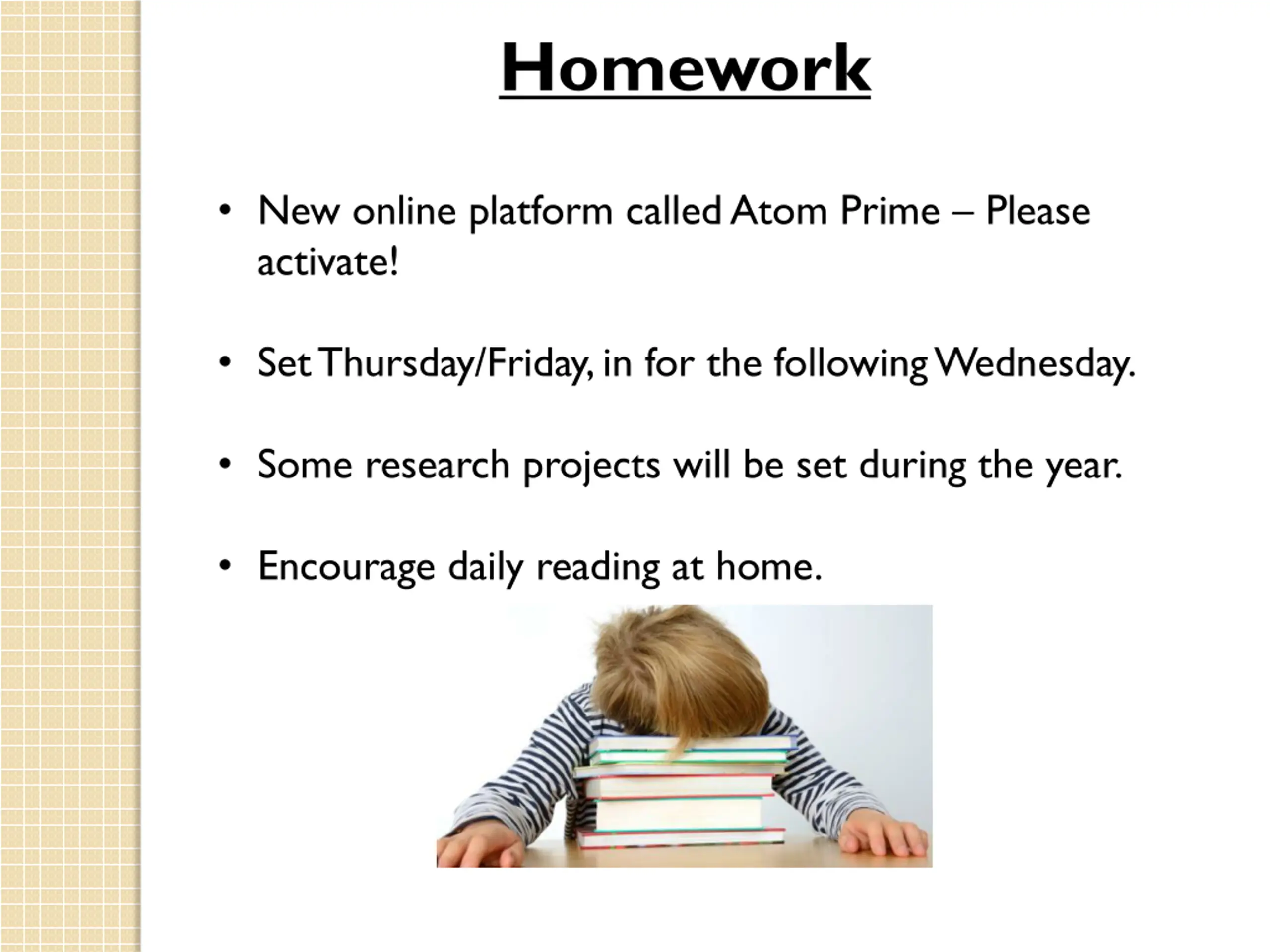 4. Homework • New online platform called Atom Prime – Please activate! • Set Thursday/Friday, in for the following Wednesday. • Some research projects will be set during the year. • Encourage daily reading at home.