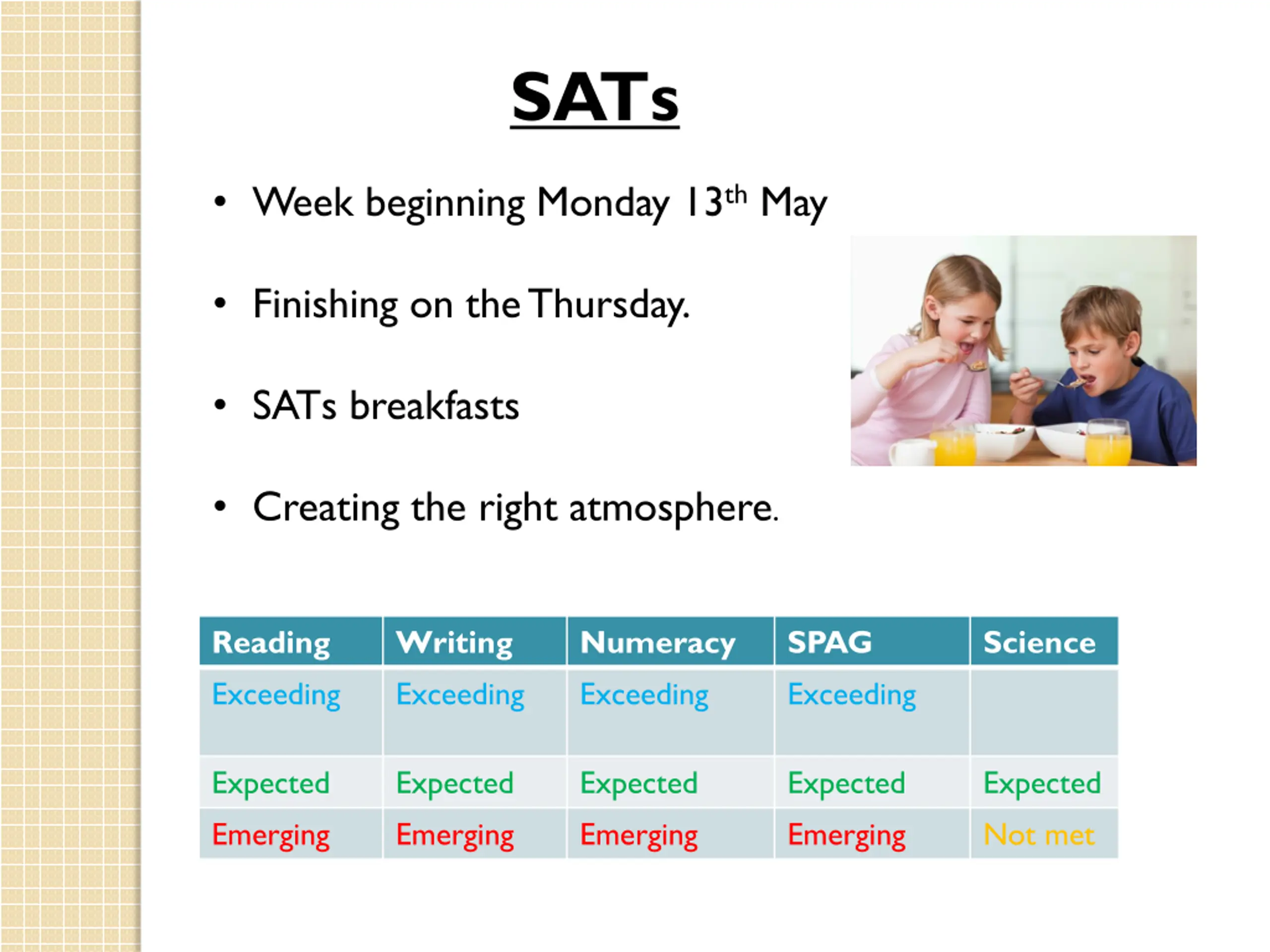 6. SATs • Week beginning Monday 13thMay • Finishing on the Thursday. • SATs breakfasts • Creating the right atmosphere. Reading Exceeding Writing Exceeding Numeracy Exceeding SPAG Exceeding Science Expected Emerging Expected Emerging Expected Emerging Expected Emerging Expected Not met