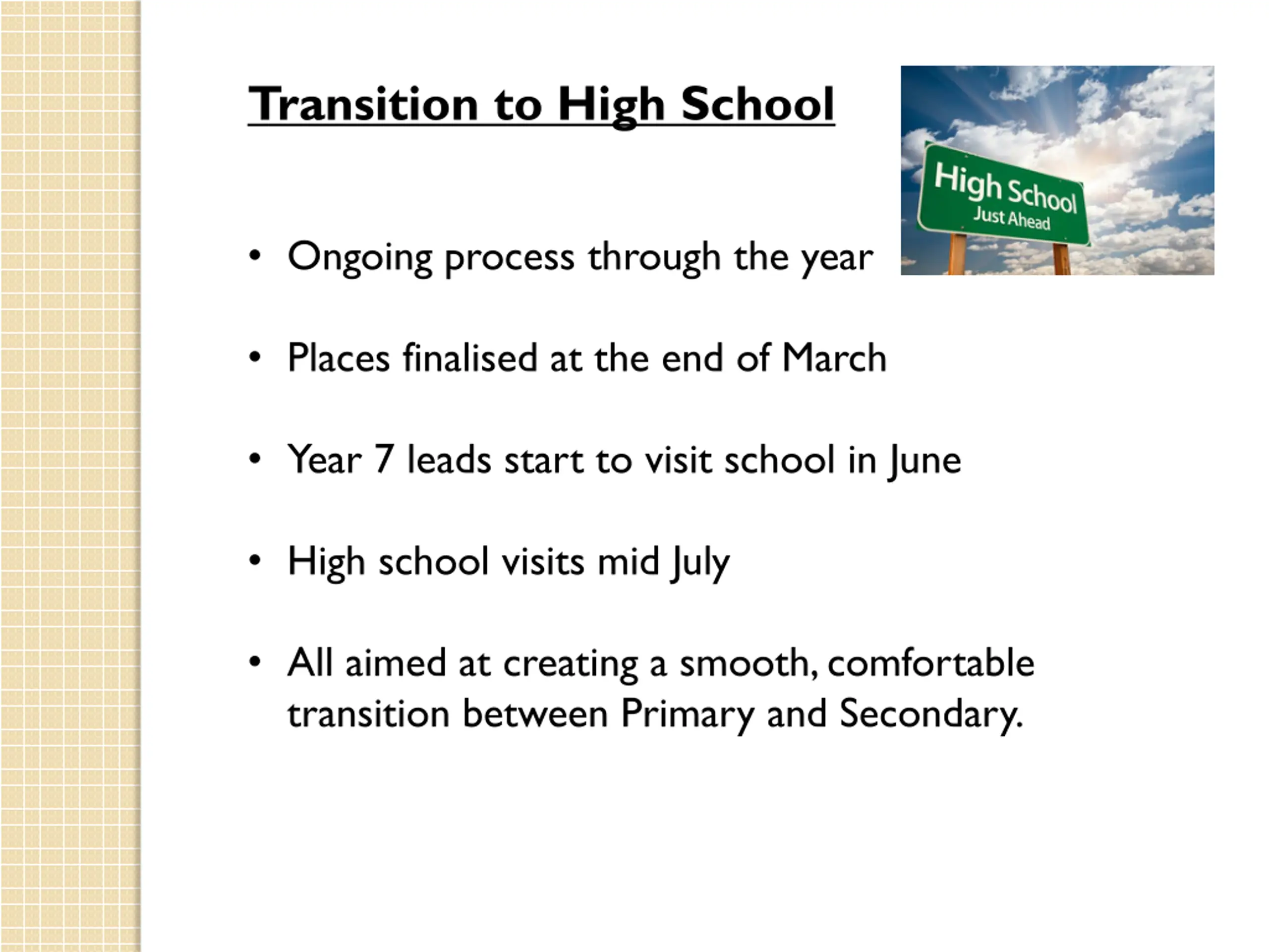 9. Transition to High School • Ongoing process through the year • Places finalised at the end of March • Year 7 leads start to visit school in June • High school visits mid July • All aimed at creating a smooth, comfortable transition between Primary and Secondary.