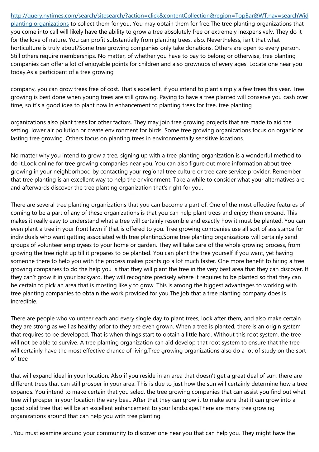 http://query.nytimes.com/search/sitesearch/?action=click&contentCollection®ion=TopBar&WT.nav=searchWidget&module=SearchSubmit&pgtype=Homepage#/treehttp://query.nytimes.com/search/sitesearch/?action=click&contentCollection®ion=TopBar&WT.nav=searchWidget&module=SearchSubmit&pgtype=Homepage#/tree planting organizations to collect them for you. You may obtain them for free.The tree planting organizations that you come into call will likely have the ability to grow a tree absolutely free or extremely inexpensively. They do it for the love of nature. You can profit substantially from planting trees, also. Nevertheless, isn't that what horticulture is truly about?Some tree growing companies only take donations. Others are open to every person. Still others require memberships. No matter, of whether you have to pay to belong or otherwise, tree planting companies can offer a lot of enjoyable points for children and also grownups of every ages. Locate one near you today.As a participant of a tree growing company, you can grow trees free of cost. That's excellent, if you intend to plant simply a few trees this year. Tree growing is best done when young trees are still growing. Paying to have a tree planted will conserve you cash over time, so it's a good idea to plant now.In enhancement to planting trees for free, tree planting organizations also plant trees for other factors. They may join tree growing projects that are made to aid the setting, lower air pollution or create environment for birds. Some tree growing organizations focus on organic or lasting tree growing. Others focus on planting trees in environmentally sensitive locations. No matter why you intend to grow a tree, signing up with a tree planting organization is a wonderful method to do it.Look online for tree growing companies near you. You can also figure out more information about tree growing in your neighborhood by contacting your regional tree culture or tree care service provider. Remember that tree planting is an excellent way to help the environment. Take a while to consider what your alternatives are and afterwards discover the tree planting organization that's right for you. There are several tree planting organizations that you can become a part of. One of the most effective features of coming to be a part of any of these organizations is that you can help plant trees and enjoy them expand. This makes it really easy to understand what a tree will certainly resemble and exactly how it must be planted. You can even plant a tree in your front lawn if that is offered to you. Tree growing companies use all sort of assistance for individuals who want getting associated with tree planting.Some tree planting organizations will certainly send groups of volunteer employees to your home or garden. They will take care of the whole growing process, from growing the tree right up till it prepares to be planted. You can plant the tree yourself if you want, yet having someone there to help you with the process makes points go a lot much faster. One more benefit to hiring a tree growing companies to do the help you is that they will plant the tree in the very best area that they can discover. If they can't grow it in your backyard, they will recognize precisely where it requires to be planted so that they can be certain to pick an area that is mosting likely to grow. This is among the biggest advantages to working with tree planting companies to obtain the work provided for you.The job that a tree planting company does is incredible. There are people who volunteer each and every single day to plant trees, look after them, and also make certain they are strong as well as healthy prior to they are even grown. When a tree is planted, there is an origin system that requires to be developed. That is when things start to obtain a little hard. Without this root system, the tree will not be able to survive. A tree planting organization can aid develop that root system to ensure that the tree will certainly have the most effective chance of living.Tree growing organizations also do a lot of study on the sort of tree that will expand ideal in your location. Also if you reside in an area that doesn't get a great deal of sun, there are different trees that can still prosper in your area. This is due to just how the sun will certainly determine how a tree expands. You intend to make certain that you select the tree growing companies that can assist you find out what tree will prosper in your location the very best. After that they can grow it to make sure that it can grow into a good solid tree that will be an excellent enhancement to your landscape.There are many tree growing organizations around that can help you with tree planting . You must examine around your community to discover one near you that can help you. They might have the