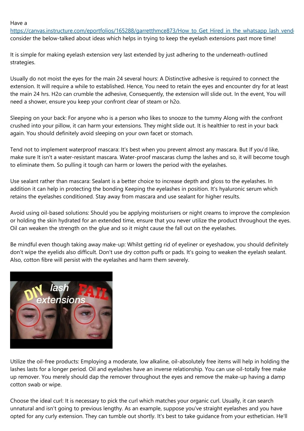 Have a https://canvas.instructure.com/eportfolios/165288/garretthmce873/How_to_Get_Hired_in_the_whatsapp_lash_vendors_Industry consider the below-talked about ideas which helps in trying to keep the eyelash extensions past more time! It is simple for making eyelash extension very last extended by just adhering to the underneath-outlined strategies. Usually do not moist the eyes for the main 24 several hours: A Distinctive adhesive is required to connect the extension. It will require a while to established. Hence, You need to retain the eyes and encounter dry for at least the main 24 hrs. H2o can crumble the adhesive, Consequently, the extension will slide out. In the event, You will need a shower, ensure you keep your confront clear of steam or h2o. Sleeping on your back: For anyone who is a person who likes to snooze to the tummy Along with the confront crushed into your pillow, it can harm your extensions. They might slide out. It is healthier to rest in your back again. You should definitely avoid sleeping on your own facet or stomach. Tend not to implement waterproof mascara: It's best when you prevent almost any mascara. But If you'd like, make sure It isn't a water-resistant mascara. Water-proof mascaras clump the lashes and so, it will become tough to eliminate them. So pulling it tough can harm or lowers the period with the eyelashes. Use sealant rather than mascara: Sealant is a better choice to increase depth and gloss to the eyelashes. In addition it can help in protecting the bonding Keeping the eyelashes in position. It's hyaluronic serum which retains the eyelashes conditioned. Stay away from mascara and use sealant for higher results. Avoid using oil-based solutions: Should you be applying moisturisers or night creams to improve the complexion or holding the skin hydrated for an extended time, ensure that you never utilize the product throughout the eyes. Oil can weaken the strength on the glue and so it might cause the fall out on the eyelashes. Be mindful even though taking away make-up: Whilst getting rid of eyeliner or eyeshadow, you should definitely don't wipe the eyelids also difficult. Don't use dry cotton puffs or pads. It's going to weaken the eyelash sealant. Also, cotton fibre will persist with the eyelashes and harm them severely. Utilize the oil-free products: Employing a moderate, low alkaline, oil-absolutely free items will help in holding the lashes lasts for a longer period. Oil and eyelashes have an inverse relationship. You can use oil-totally free make up remover. You merely should dap the remover throughout the eyes and remove the make-up having a damp cotton swab or wipe. Choose the ideal curl: It is necessary to pick the curl which matches your organic curl. Usually, it can search unnatural and isn't going to previous lengthy. As an example, suppose you've straight eyelashes and you have opted for any curly extension. They can tumble out shortly. It's best to take guidance from your esthetician. He'll