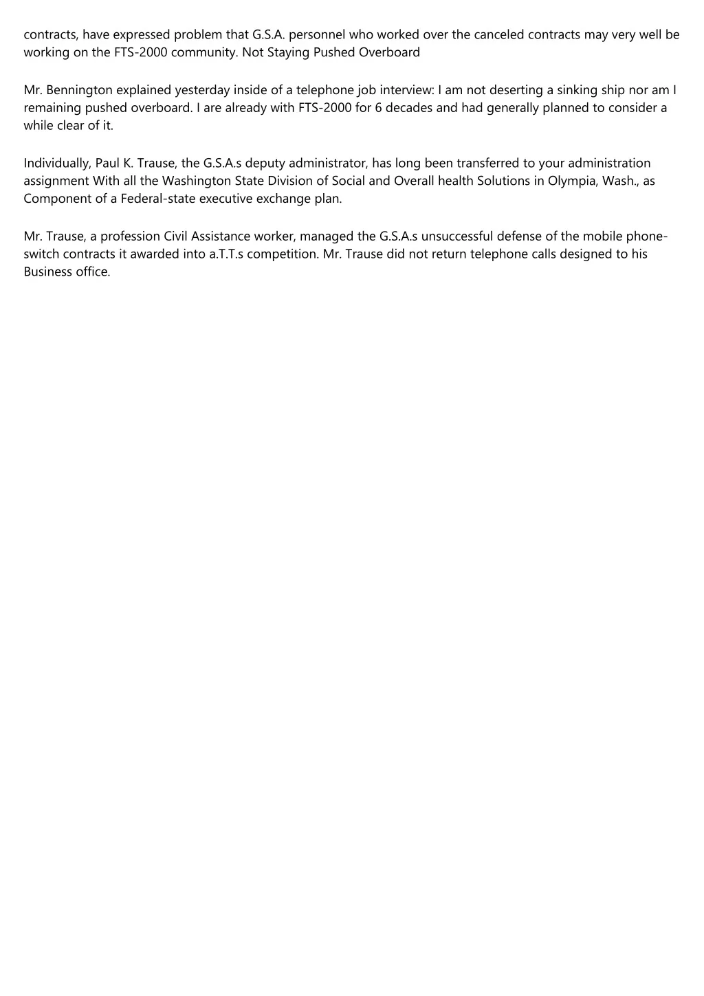 contracts, have expressed problem that G.S.A. personnel who worked over the canceled contracts may very well be working on the FTS-2000 community. Not Staying Pushed Overboard Mr. Bennington explained yesterday inside of a telephone job interview: I am not deserting a sinking ship nor am I remaining pushed overboard. I are already with FTS-2000 for 6 decades and had generally planned to consider a while clear of it. Individually, Paul K. Trause, the G.S.A.s deputy administrator, has long been transferred to your administration assignment With all the Washington State Division of Social and Overall health Solutions in Olympia, Wash., as Component of a Federal-state executive exchange plan. Mr. Trause, a profession Civil Assistance worker, managed the G.S.A.s unsuccessful defense of the mobile phone- switch contracts it awarded into a.T.T.s competition. Mr. Trause did not return telephone calls designed to his Business office.