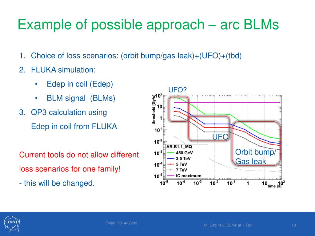 Example of possible approach – arc BLMs • Choice of loss scenarios: (orbit bump/gas leak)+(UFO)+(tbd) • FLUKA simulation: • Edep in coil (Edep) • BLM signal (BLMs) • QP3 calculation usingEdep in coil from FLUKA • Current tools do not allow differentloss scenarios for one family!- this will be changed. UFO? UFO Orbit bump/ Gas leak M. Sapinski, BLMs at 7 TeV