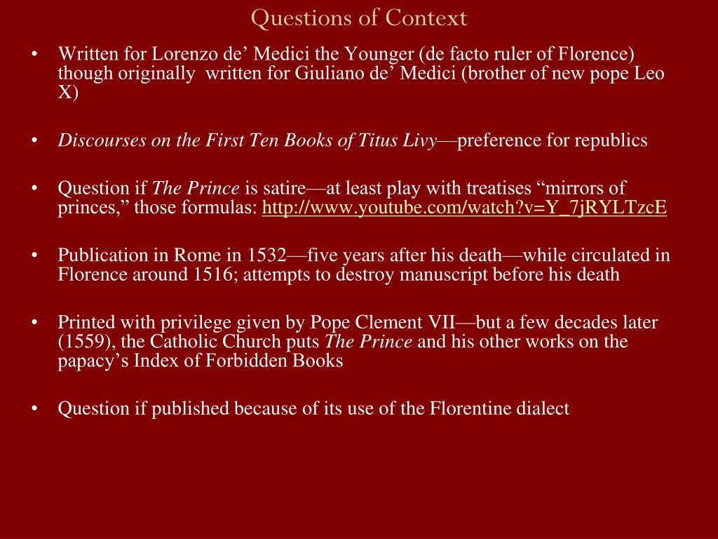 Questions of Context • Written for Lorenzo de’ Medici the Younger (de facto ruler of Florence) though originally written for Giuliano de’ Medici (brother of new pope Leo X) • Discourses on the First Ten Books of Titus Livy—preference for republics • Question if The Prince is satire—at least play with treatises “mirrors of princes,” those formulas: http://www.youtube.com/watch?v=Y_7jRYLTzcE • Publication in Rome in 1532—five years after his death—while circulated in Florence around 1516; attempts to destroy manuscript before his death • Printed with privilege given by Pope Clement VII—but a few decades later (1559), the Catholic Church puts The Prince and his other works on the papacy’s Index of Forbidden Books • Question if published because of its use of the Florentine dialect
