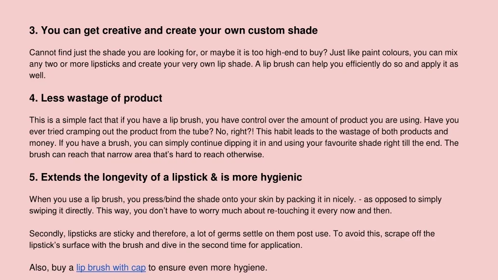 3. You can get creative and create your own custom shade Cannot find just the shade you are looking for, or maybe it is too high-end to buy? Just like paint colours, you can mix any two or more lipsticks and create your very own lip shade. A lip brush can help you efficiently do so and apply it as well. 4. Less wastage of product This is a simple fact that if you have a lip brush, you have control over the amount of product you are using. Have you ever tried cramping out the product from the tube? No, right?! This habit leads to the wastage of both products and money. If you have a brush, you can simply continue dipping it in and using your favourite shade right till the end. The brush can reach that narrow area that’s hard to reach otherwise. 5. Extends the longevity of a lipstick & is more hygienic When you use a lip brush, you press/bind the shade onto your skin by packing it in nicely. - as opposed to simply swiping it directly. This way, you don’t have to worry much about re-touching it every now and then. Secondly, lipsticks are sticky and therefore, a lot of germs settle on them post use. To avoid this, scrape off the lipstick’s surface with the brush and dive in the second time for application. Also, buy a lip brush with cap to ensure even more hygiene.