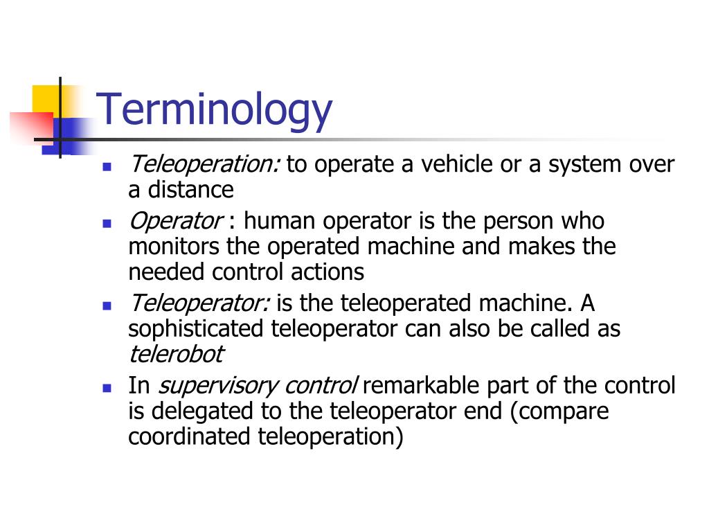 Terminology • Teleoperation: to operate a vehicle or a system over a distance • Operator : human operator is the person who monitors the operated machine and makes the needed control actions • Teleoperator: is the teleoperated machine. A sophisticated teleoperator can also be called as telerobot • In supervisory control remarkable part of the control is delegated to the teleoperator end (compare coordinated teleoperation)