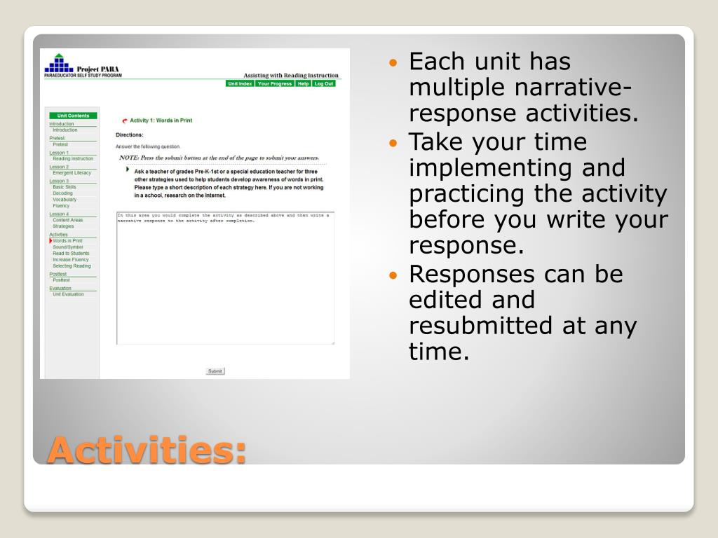 Each unit has multiple narrative-response activities. • Take your time implementing and practicing the activity before you write your response. • Responses can be edited and resubmitted at any time. Activities: