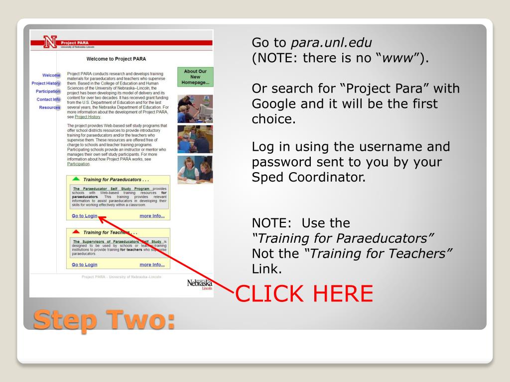 Go to para.unl.edu (NOTE: there is no “www”). Or search for “Project Para” with Google and it will be the first choice. Log in using the username and password sent to you by your Sped Coordinator. NOTE: Use the “Training for Paraeducators” Not the “Training for Teachers” Link. CLICK HERE Step Two: