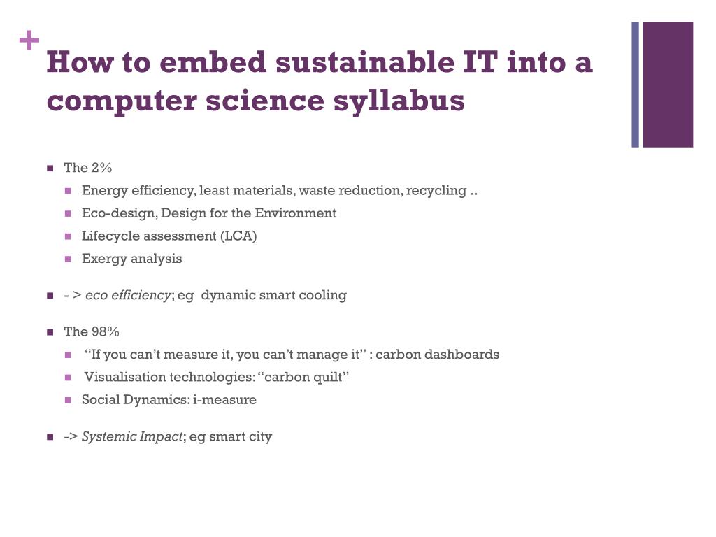How to embed sustainable IT into a computer science syllabus • The 2% • Energy efficiency, least materials, waste reduction, recycling .. • Eco-design, Design for the Environment • Lifecycle assessment (LCA) • Exergy analysis • - > eco efficiency; eg dynamic smart cooling • The 98% • “If you can’t measure it, you can’t manage it” : carbon dashboards • Visualisation technologies: “carbon quilt” • Social Dynamics: i-measure • -> Systemic Impact; eg smart city