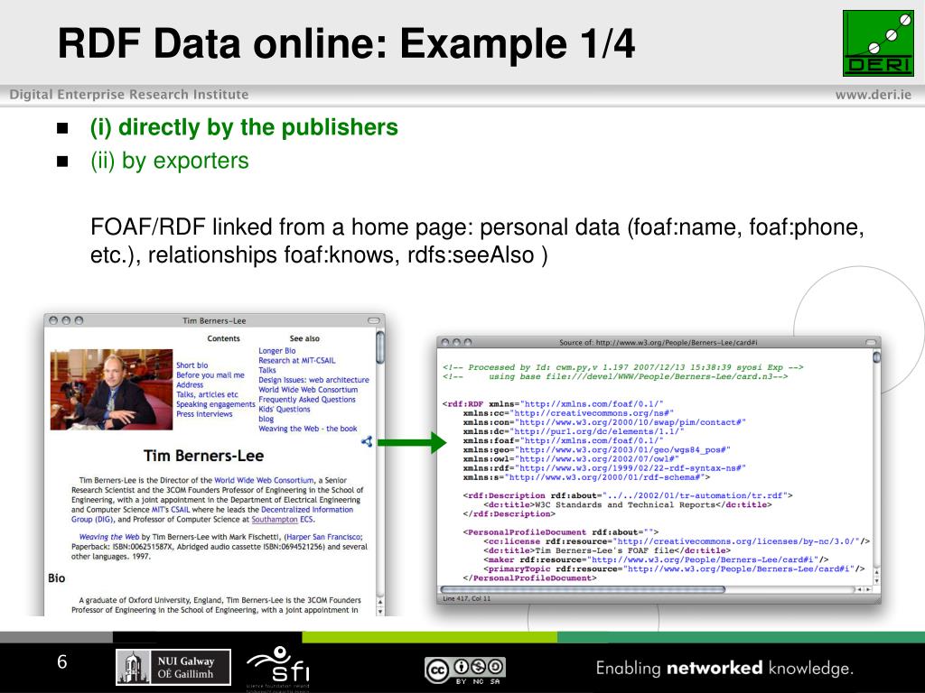 RDF Data online: Example 1/4 (i) directly by the publishers (ii) by exporters FOAF/RDF linked from a home page: personal data (foaf:name, foaf:phone, etc.), relationships foaf:knows, rdfs:seeAlso ) 6