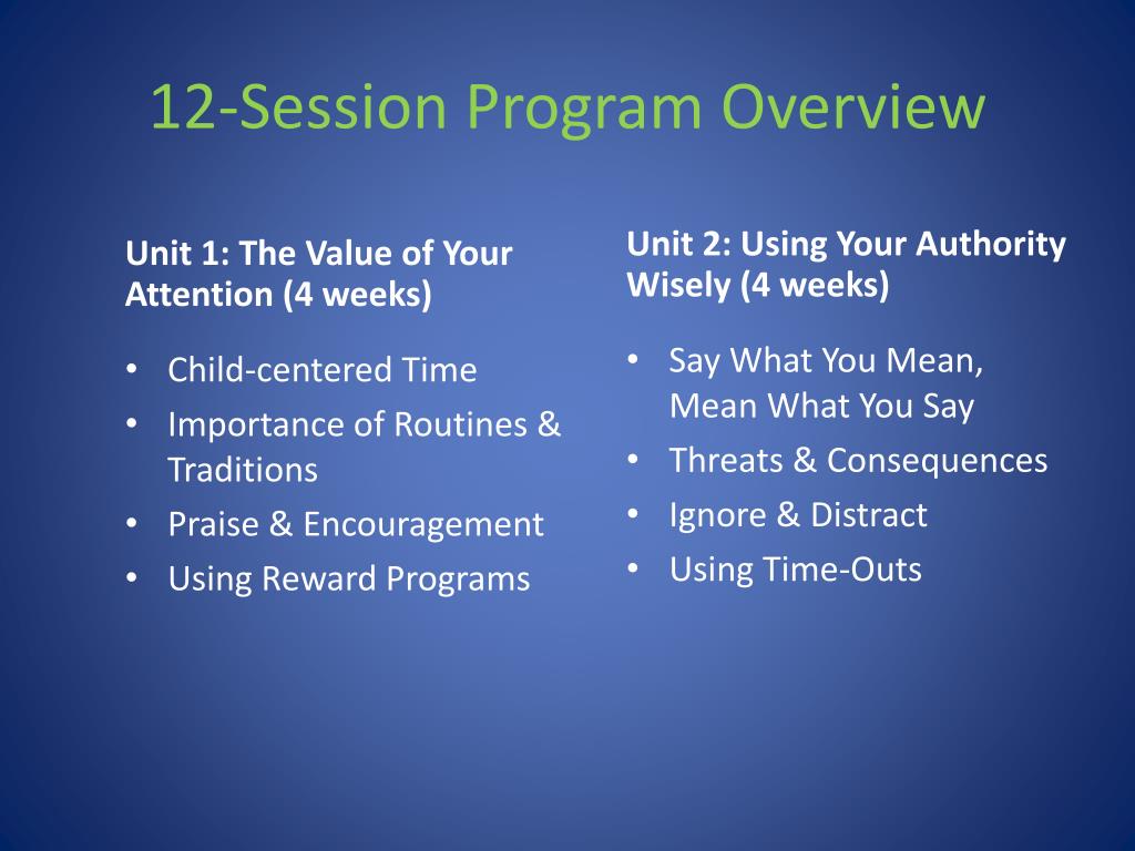 12-Session Program Overview Unit 1: The Value of Your Attention (4 weeks) Unit 2: Using Your Authority Wisely (4 weeks) Say What You Mean, Mean What You Say Threats & Consequences Ignore & Distract Using Time-Outs • Child-centered Time • Importance of Routines & Traditions • Praise & Encouragement • Using Reward Programs
