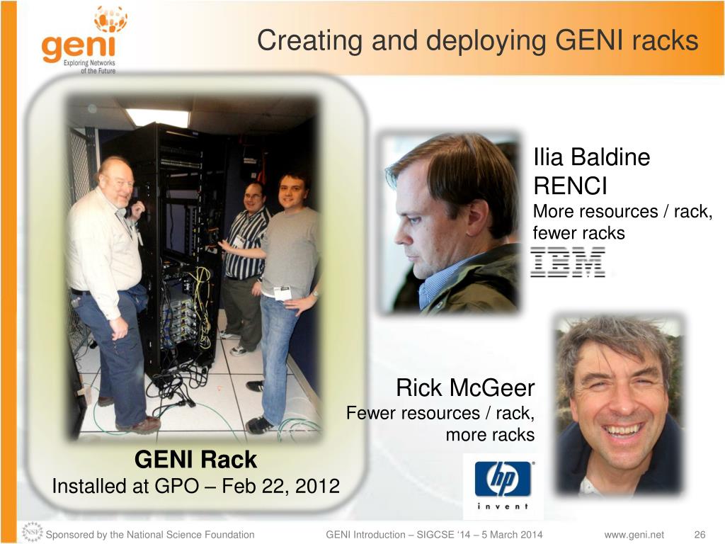 Creating and deploying GENI racks Ilia Baldine RENCI More resources / rack,fewer racks Rick McGeer Fewer resources / rack,more racks GENI Rack Installed at GPO – Feb 22, 2012
