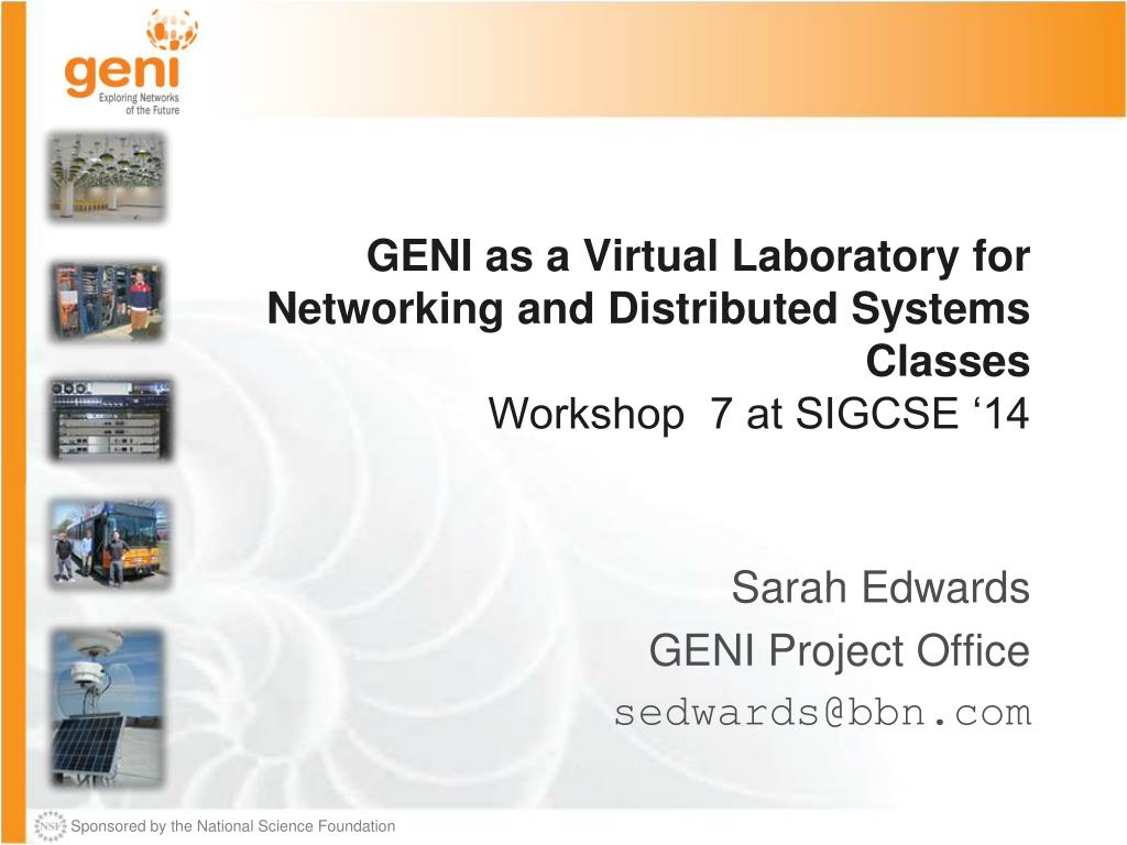 GENI as a Virtual Laboratory for Networking and Distributed Systems Classes Workshop 7 at SIGCSE ‘14. Sarah Edwards GENI Project Office sedwards@bbn.com. Agenda. Presentation and Demo: An Introduction to GENI ( 45min) Hands -on: Getting Started with GENI ( 45min) Break ( 10min)