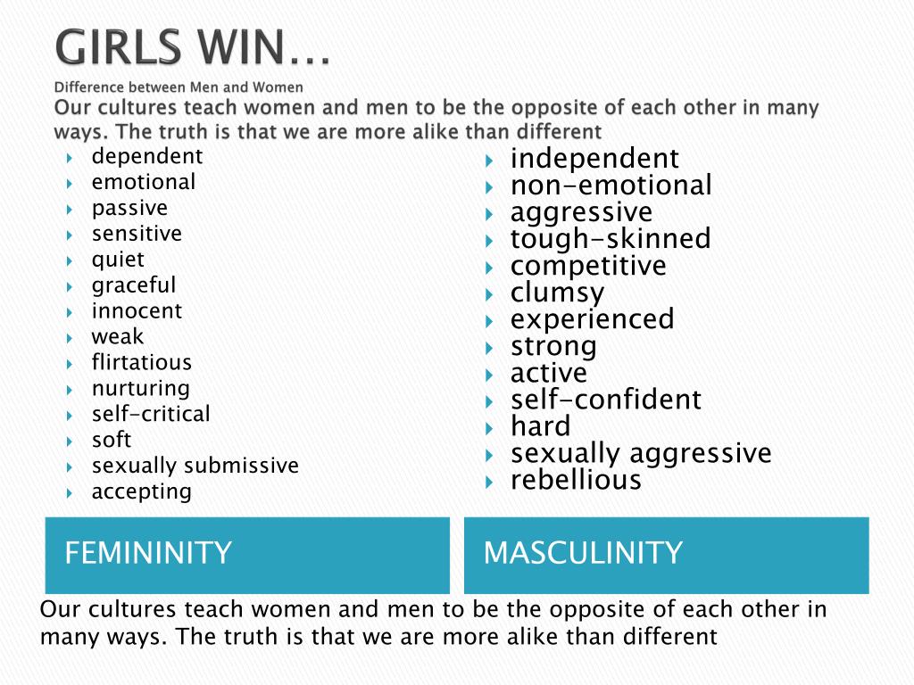 GIRLS WIN…Difference between Men and Women Our cultures teach women and men to be the opposite of each other in many ways. The truth is that we are more alike than different • dependent • emotional • passive • sensitive • quiet • graceful • innocent • weak • flirtatious • nurturing • self-critical • soft • sexually submissive • accepting • independent • non-emotional • aggressive • tough-skinned • competitive • clumsy • experienced • strong • active • self-confident • hard • sexually aggressive • rebellious FEMININITY MASCULINITY Our cultures teach women and men to be the opposite of each other in many ways. The truth is that we are more alike than different