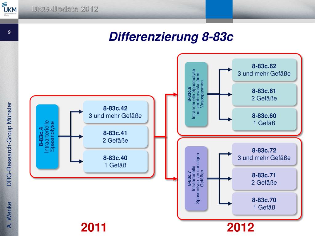 Differenzierung 8-83c 8-83c.4IntraarterielleSpasmolyse 8-83c.6IntraarterielleSpasmolyse bei zerebrovaskulärenVasospasmen 8-83c.7IntraarterielleSpasmolyse an sonstigen Gefäßen 8-83c.401 Gefäß 8-83c.412 Gefäße 8-83c.423 und mehr Gefäße 8-83c.601 Gefäß 8-83c.612 Gefäße 8-83c.623 und mehr Gefäße 8-83c.701 Gefäß 8-83c.712 Gefäße 8-83c.723 und mehr Gefäße 2011 2012
