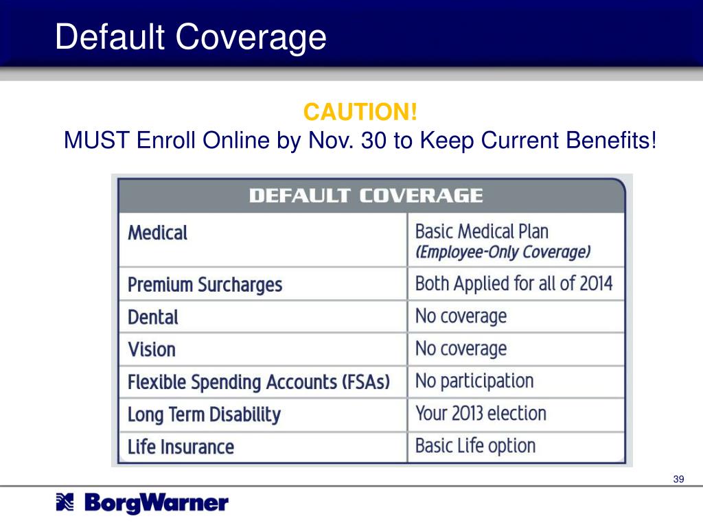 Default Coverage CAUTION! MUST Enroll Online by Nov. 30 to Keep Current Benefits!