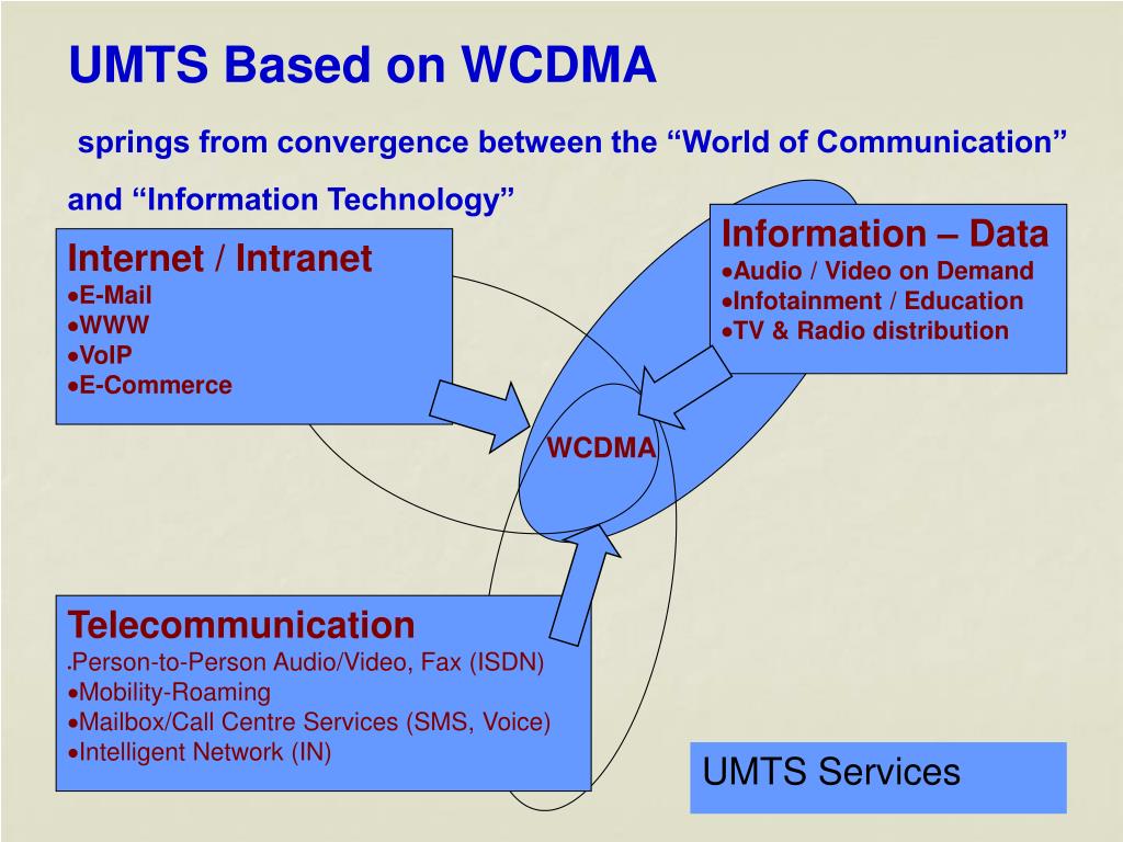 Information – Data ·Audio / Video on Demand ·Infotainment / Education ·TV & Radio distribution Internet / Intranet ·E-Mail ·WWW ·VoIP ·E-Commerce WCDMA Telecommunication ·Person-to-Person Audio/Video, Fax (ISDN) ·Mobility-Roaming ·Mailbox/Call Centre Services (SMS, Voice) ·Intelligent Network (IN) UMTS Services UMTS Based on WCDMA springs from convergence between the “World of Communication” and “Information Technology”