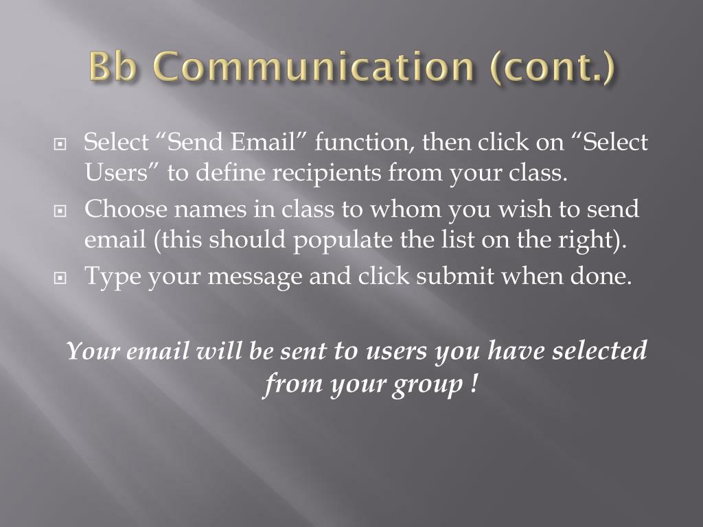 Bb Communication (cont.) • Select “Send Email” function, then click on “Select Users” to define recipients from your class. • Choose names in class to whom you wish to send email (this should populate the list on the right). • Type your message and click submit when done. Your email will be sent to users you have selected from your group !